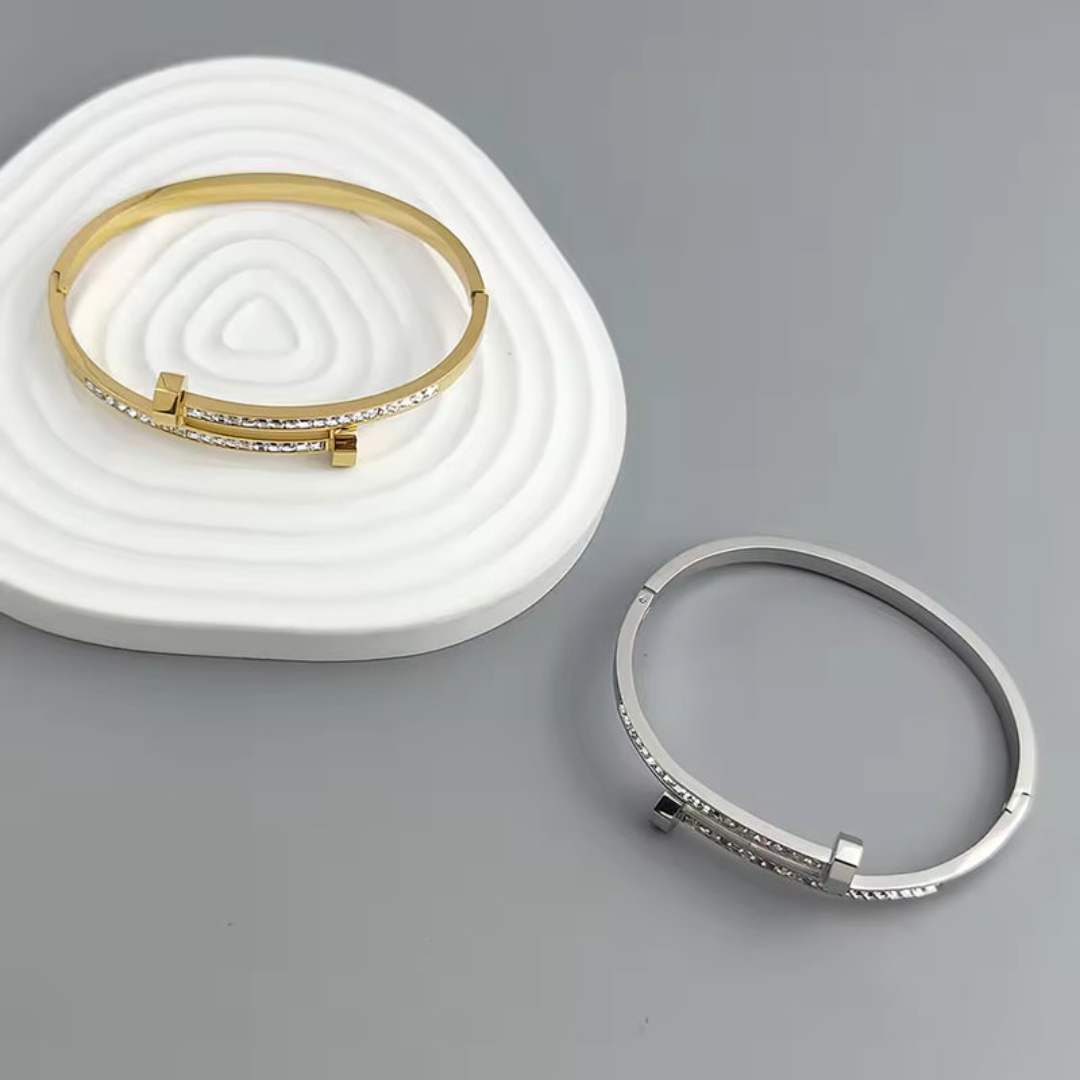 Estas elegantes pulseras de diseño moderno destacan por su distintiva forma de “U” invertida, aportando un estilo contemporáneo y sofisticado. Fabricadas en acero inoxidable de alta calidad, están disponibles en acabados oro brillante y plata pulida, lo que las convierte en accesorios versátiles y duraderos. Su línea de circonias cuidadosamente incrustadas aporta un destello refinado que eleva cualquier look, desde lo casual hasta lo más elegante.